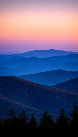 Captivating blue mountains at dusk showcase smooth contours and gentle shadows creating a tranquil landscape, perfect for relaxation and nature appreciation.
