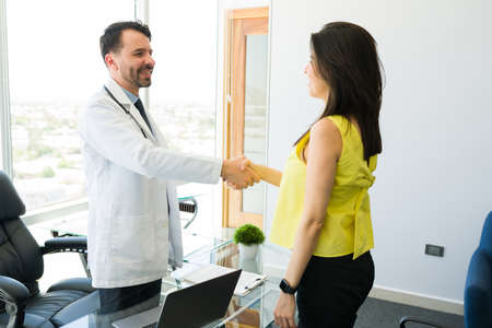 Happy medical specialist shaking hands with a female patient in his office. Rear view of an attractive woman with an appointment with a doctor