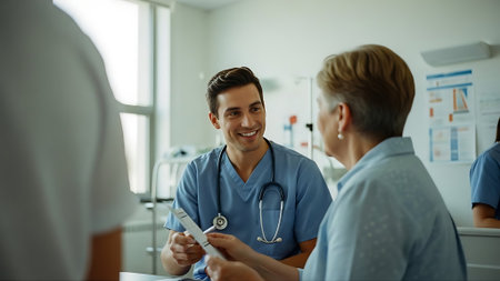 A smiling female doctor in a white coat with a stethoscope talks to a senior male patient in a hospital waiting room, surrounded by medical staff and other patients.