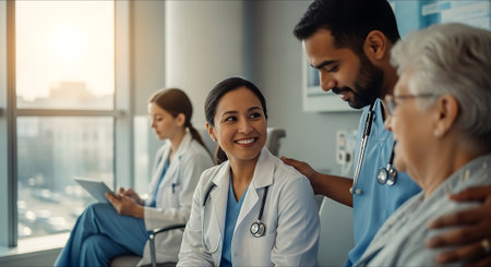 A smiling female doctor and a male doctor in blue scrubs interact with an elderly patient, while another female doctor sits in the background, in a well-lit hospital room with a city view.