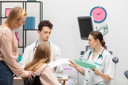A student is sitting at a table with two female doctors. They discuss the results of the patient's tests and the treatment and rehabilitation plan. Medicine and health.