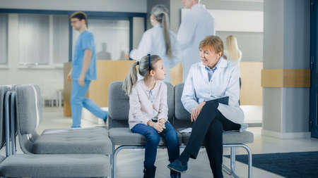 In the Lobby of the Hospital Female Doctor Talks with a Cute Little Girl while Sitting on the Sofa. Busy Modern Hospital with Best Possible Pediatrics Department in Country.