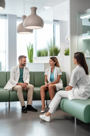 Generative AI : Delighted parents and daughter sitting on sofa and communicating with male medical practitioner during visit in modern hospital