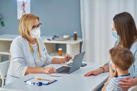 A female doctor in a white coat consults with a young boy in an examination room, discussing his health and well-being.