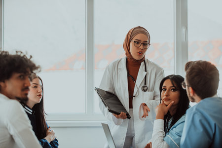 A group of multiethnic medical professionals including doctors, surgeons, and nurses are gathered in a hospital setting discussing patient care and using modern technology to address challenges in the medical field.