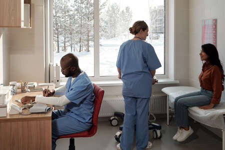 Young female patient waiting for ultrasound examination and talking to nurse while male doctor making notes or prescriptions
