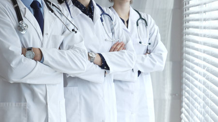 Medical team standing with arms crossed, focusing on healthcare professionals in white lab coats, representing medicine, expertise, and unity in a clinic setting