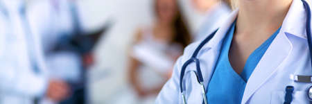 Doctor with stethoscope in medical coat on white background. Front position half body without head. Nurse in uniform healthcare concept. Horizontal panoramic composition. Medical industry concept