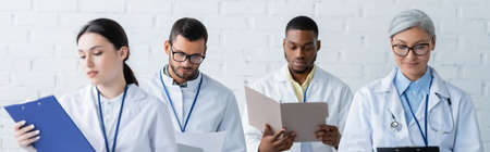 multicultural physicians looking at clipboards and paper folders during conference, banner