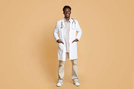 Portrait of happy african american mid adult woman with stethoscope and hands in pockets, copy space. white background, confidence, doctor, medical, healthcare, hospital and medical occupation.