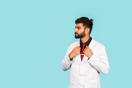 Handsome modern indian / asian doctor with stethoscope, tie and white coat on blue background medicine, healthcare