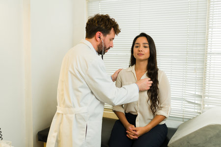 A black girl doctor examines a Mexican patient in a doctors office Palpates the lymph nodes of the neck