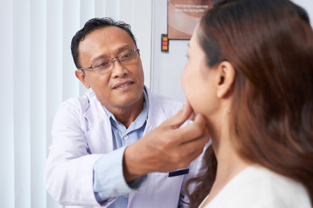 Healthcare professional examining patients neck with medical gloves inside an examination room during a routine check-up for thyroid and lymph node inspection
