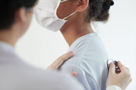 Doctor with stethoscope listening to breath of teenage girl during annual check-up