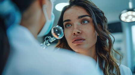Dermatologist examining patient's birthmark in clinic, closeup view
