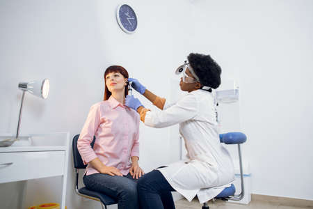 Young attractive Caucasian woman getting medical ear exam at modern clinic. Female afro ent practitioner examining ear of patient, using an otoscope, in a doctors office