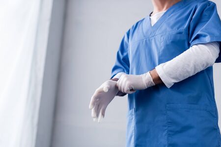 cropped view of mature doctor wearing latex glove on white