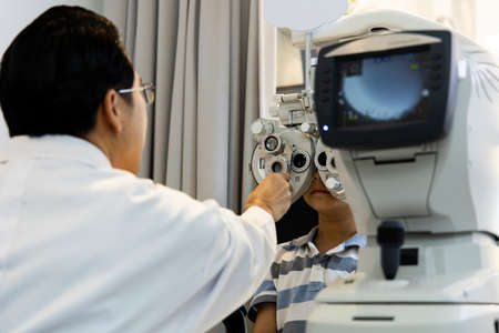 Boy doing eye test checking examination with optometrist in optical shop, Optometrist doing sight testing for child patient in clinic