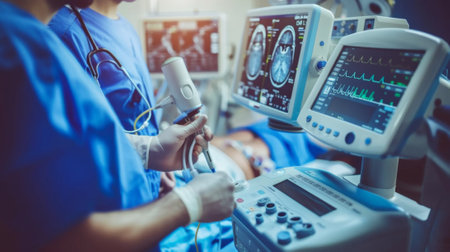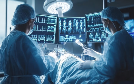 Surgeons in an operating room performing surgery with advanced medical technology, multiple screens displaying patient data and imaging.
