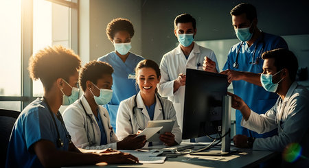 A diverse group of medical professionals in scrubs and masks gathered around a tablet