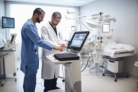 two people working in a hospital room, one is using a laptop and the other is standing next to him. Doctor and Medical Robot Working Together - Generative AI