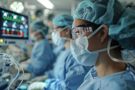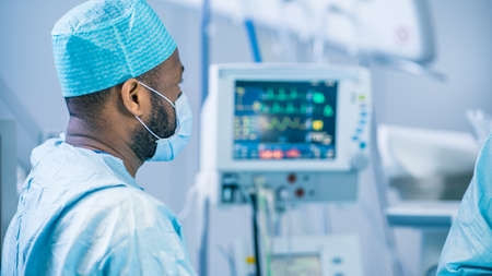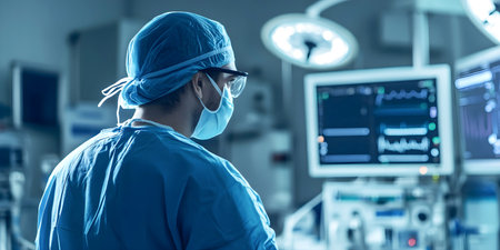 Surgeon in operating room wearing mask and gown, monitoring patient vitals on medical screens under surgical lights. High quality photo