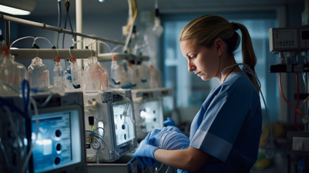 Healthcare worker analyzes vital patient data from advanced monitors in urgent care.