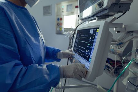 Mid section of Caucasian surgeon using the medical monitor in operation theater at hospital
