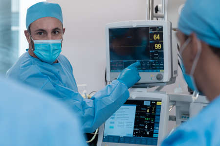 Caucasian male doctor wearing face mask and surgical overalls pointing at monitor. medicine, health and healthcare services during coronavirus covid 19 pandemic.