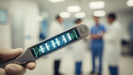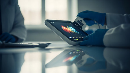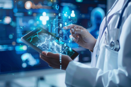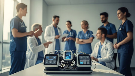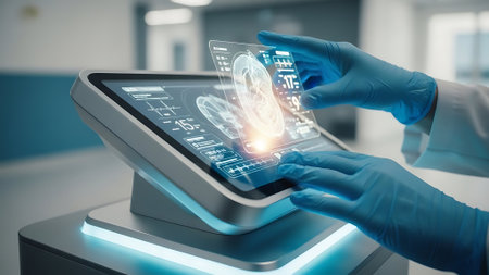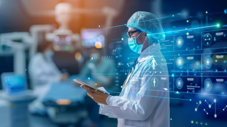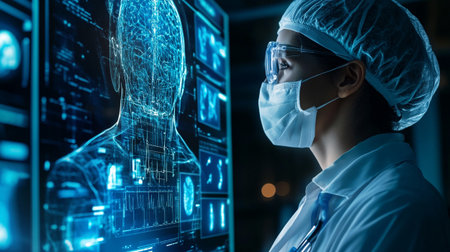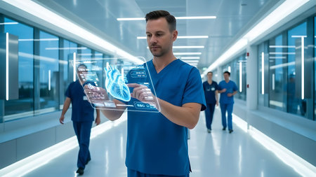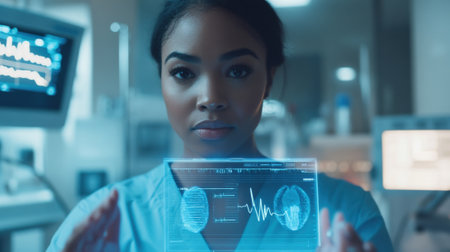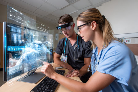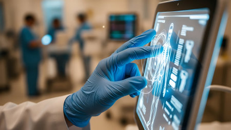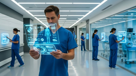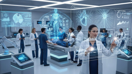 Medical staff collaborate on a futuristic interface to analyze patient data and improve care efficiency.