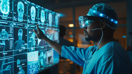 A surgeon uses augmented reality glasses to review and interact with digital medical scans and images in a modern clinic.