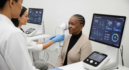 A senior African woman sits in a medical office while a young Hispanic woman in a lab coat conducts a health examination. Medical equipment is visible in the background.