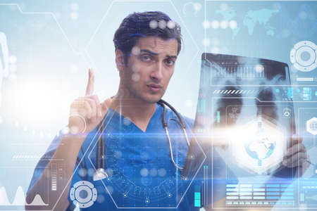 Digital interface with medical data processing against male doctor using digital tablet. medical research and technology concept