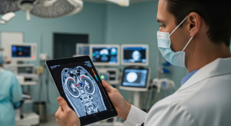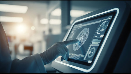 A doctor reviews a detailed MRI of the brain on a digital tablet within a modern medical facility.