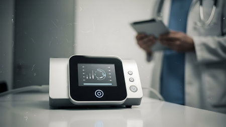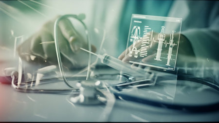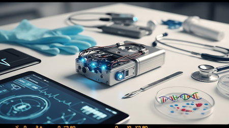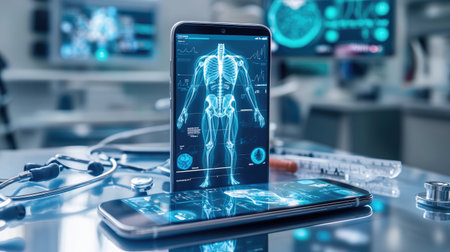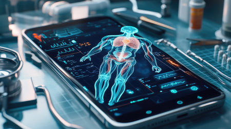 Advanced e-health app displaying a human anatomy interface on a smartphone, with medical tools nearby