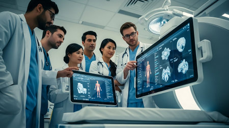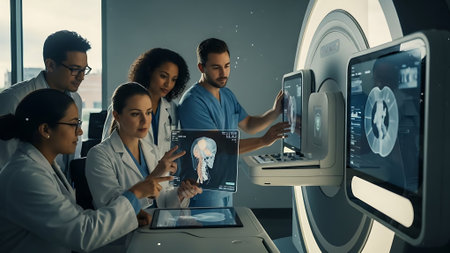 Medical team collaborates on diagnostic procedures and treatment plans. Professionals in radiology and radiography support accurate diagnosis and effective disease prevention, insurance.