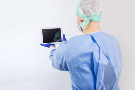 Surgeon doctor in sterile gloves preparing for operation using tablet computer. He is wearing surgical cap and blue gown