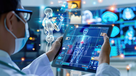 A modern digital tablet displays a holographic representation of human anatomy, showcasing advanced medical technology in a dynamic healthcare setting.