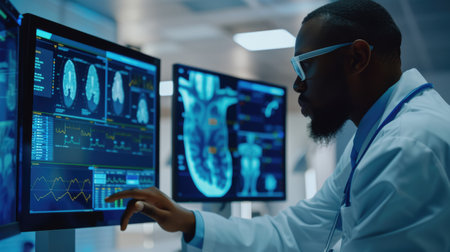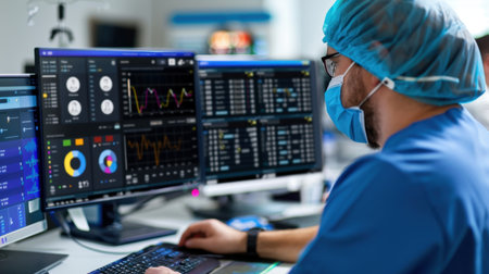 A focused medical professional analyzes critical healthcare data on multiple screens, showcasing intricate charts and graphs in a modern clinical environment.