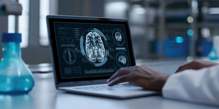 Professional doctor analyzing patient symptom while looking at laptop and sitting at hospital. Photography of scientist using AI diagnosis and planning treatment method. Healthcare concept. AIG42.
