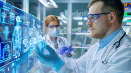 A dedicated medical team engages with advanced technology in a modern laboratory, analyzing critical healthcare data using innovative digital displays.