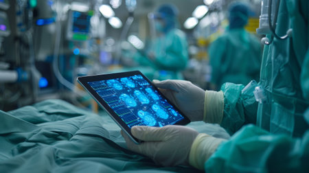 Medical doctor using futuristic transparent tablet showing brain scan and data in hospital operating room