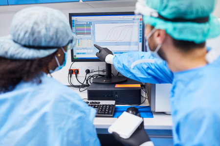 Biotechnolgie researcher evaluating experiment on computer in laboratory