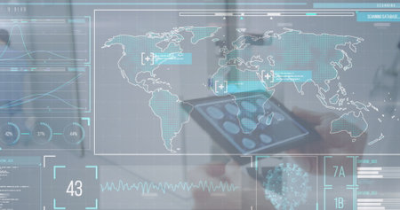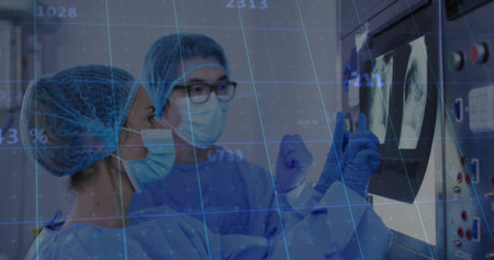 Image of scientific data processing over diverse surgeons in hospital. Global medicine, science, data processing and digital interface concept digitally generated image.