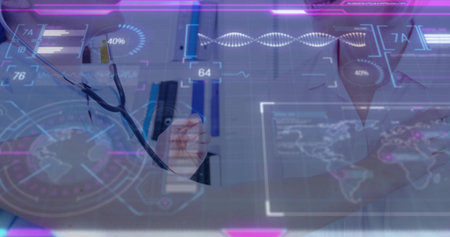 Medical professional manipulating holographic bar chart in lab interface, coat, gloves, stethoscope. Healthcare, technology, innovation, data visualization, science, digital interface, precision