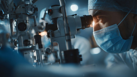 An expert surgeon performs delicate eye microsurgery, surrounded by advanced equipment and bright lights that highlight the intricate details.
