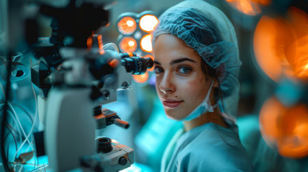 Female surgeon performs an eye operation in a well-equipped medical facility, surrounded by modern surgical technology and lighting.