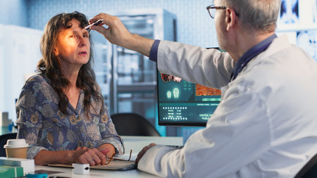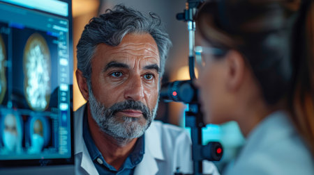 In a bright, modern medical office, a healthcare professional is intently examining a patients eye with an advanced otoscope. The patient, a middle-aged man, displays a calm demeanor as he undergoes this important check-up, highlighting the trust and professionalism in the healthcare environment.