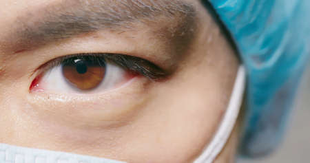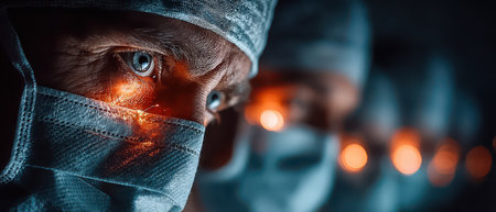 Intense close-up of a surgeon's focused blue eyes, partially covered by a mask and surgical cap under sterile lighting.