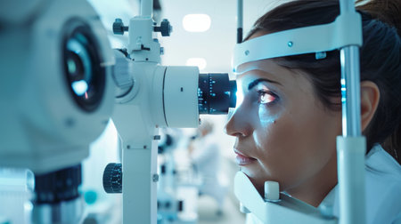 Woman Undergoing Eye Exam with Modern Equipment, Vision Care and Ophthalmology Concept